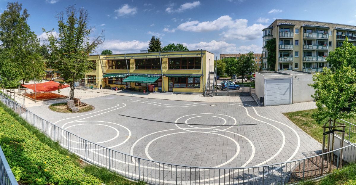 Die großzügige, multifunktionaleFlächehinter dem langgestreckten Gebäude ist der einzige Bereich im Garten, der nicht am Hang liegt. Zum restlichen Garten abgetrennt ist sie durch eine lange Mauer aus Betonsitzblöcken.Die etwa 900 Quadratmeter große Pflasterfläche dient als Außensitzbereich für die Gruppenräume und natürlich als große Bewegungsfläche zum Rennen und Befahren. In einem Teilbereich gibt eine Fahrbahnmarkierung aus geschwungenen weißen Linien die Fahrtrichtung für Roller, Dreiräder, Bobby-Cars und Co. vor.