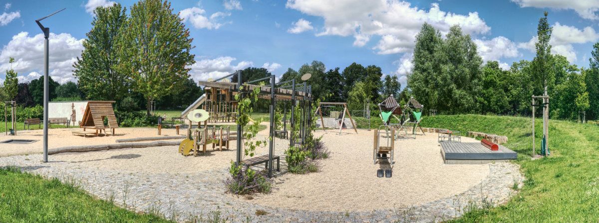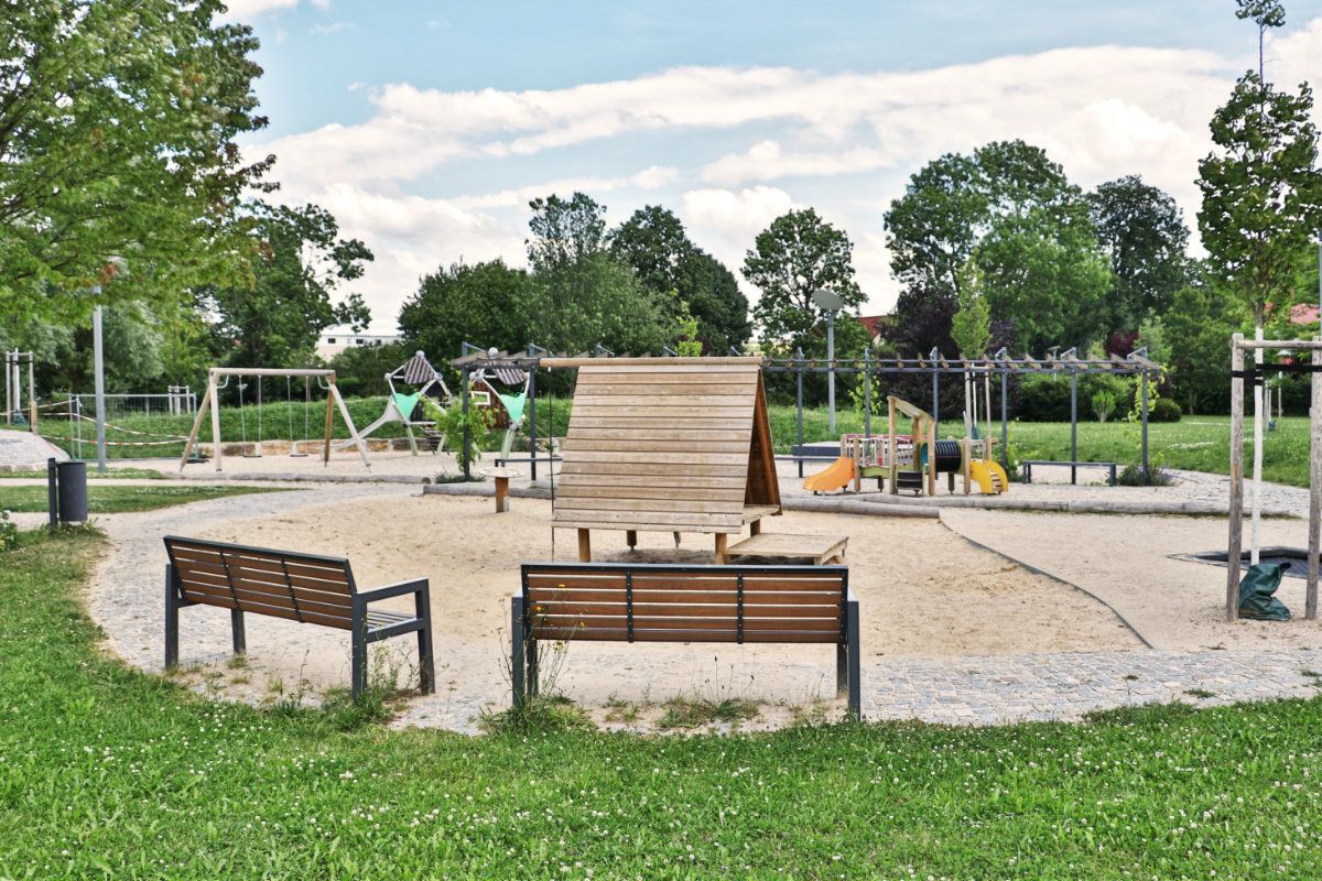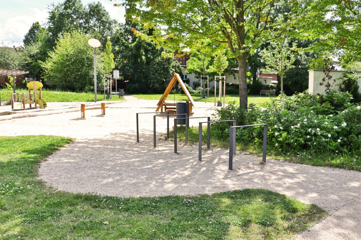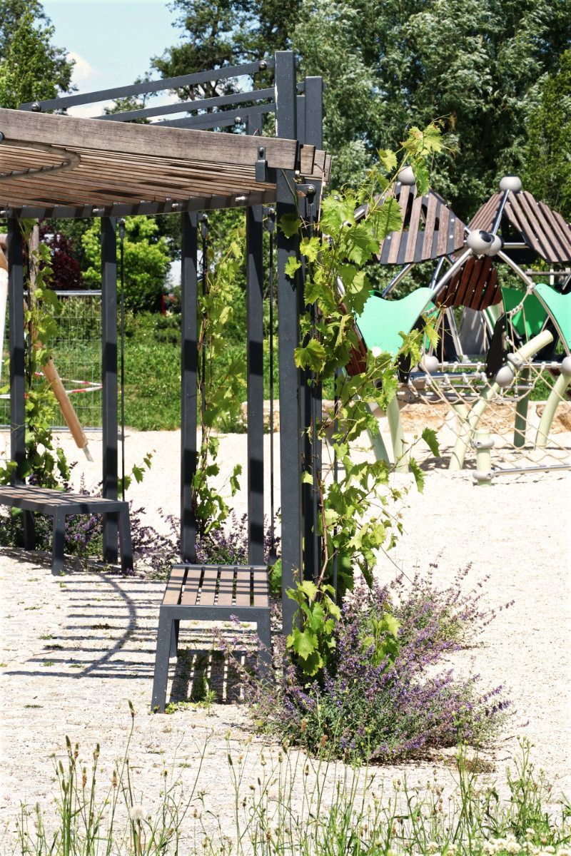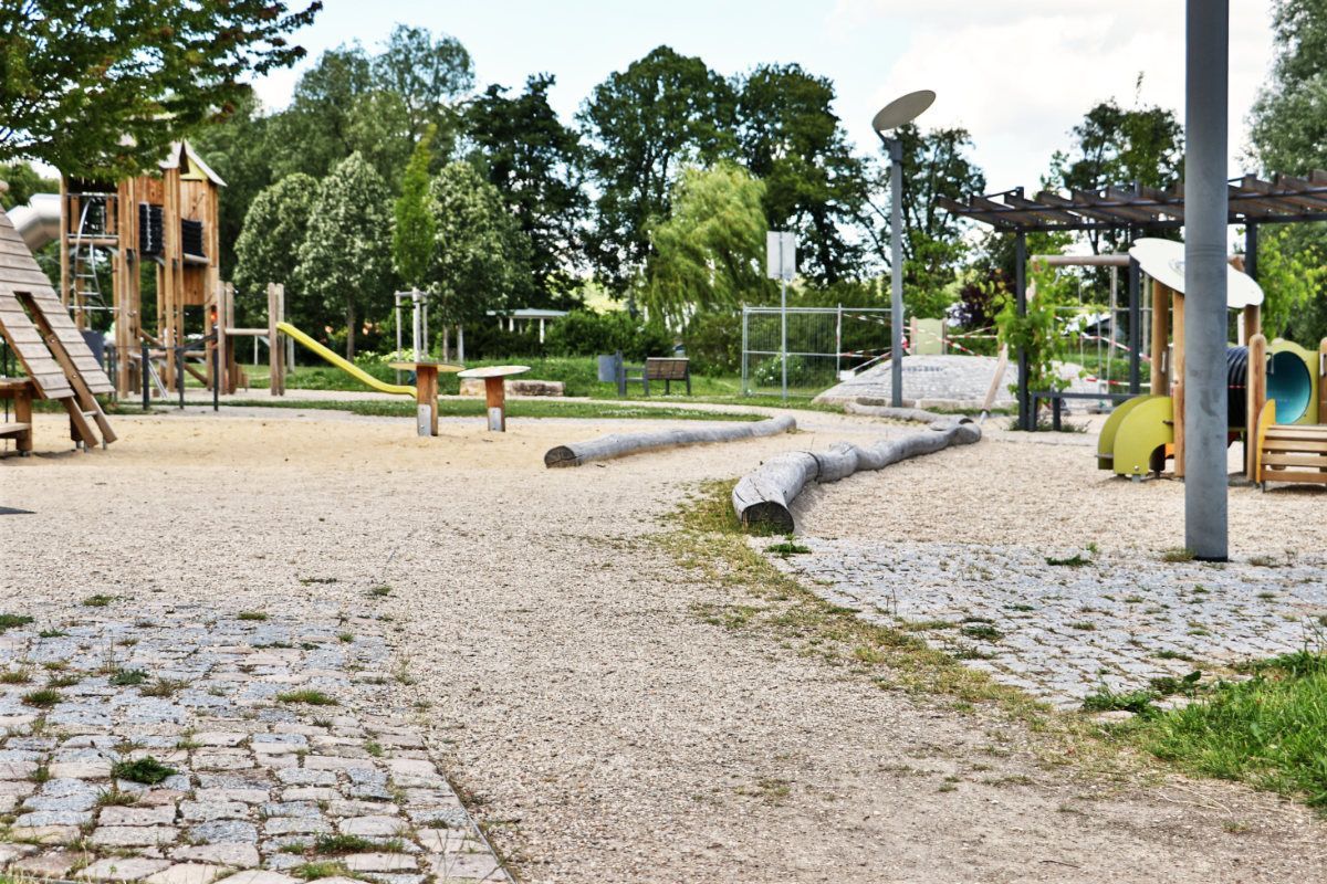 Eine berankte Pergola sowie mehrere neu gepflanzte Bäume spenden Schatten. Ausreichend Sitzmöglichkeiten und Fahrradständer bieten Platz für viele kleine und große Besucher. Die Erschließungswege des Spielplatzes sind mit Granitkleinpflaster belegt.
