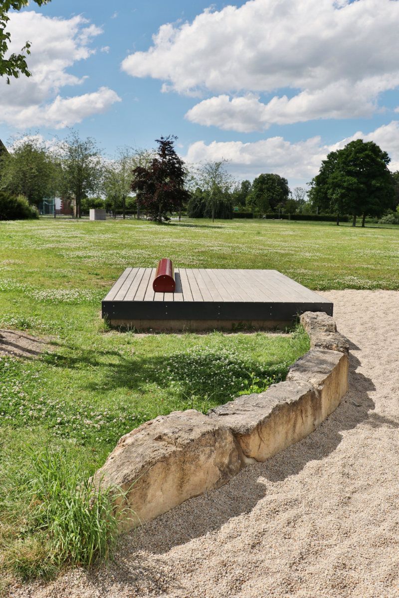 Die Spielflächen sind mit dicken Robinienholzstämmen eingefasst, auf denen man auch sitzen kann. Jugendliche können auf zwei Holzpodesten abhängen, die wie große Liegen mit Nackenrolle gestaltet sind.