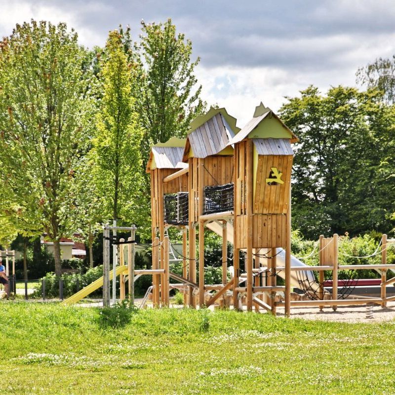 Eine mehrere Meter hohe Spielanlage fordert die Großen zum Klettern, Erkunden und Toben auf. Auch die klassischen Spielelemente wie Rutschen, Schaukeln, Wippen, Karussell fahren und Trampolin springen kommen nicht zu kurz. Ein Kriechtunnel durch den Erdwall bietet Spannung für die jüngeren Kinder, denn das andere Ende ist beim Hineinkriechen nicht zu sehen.
